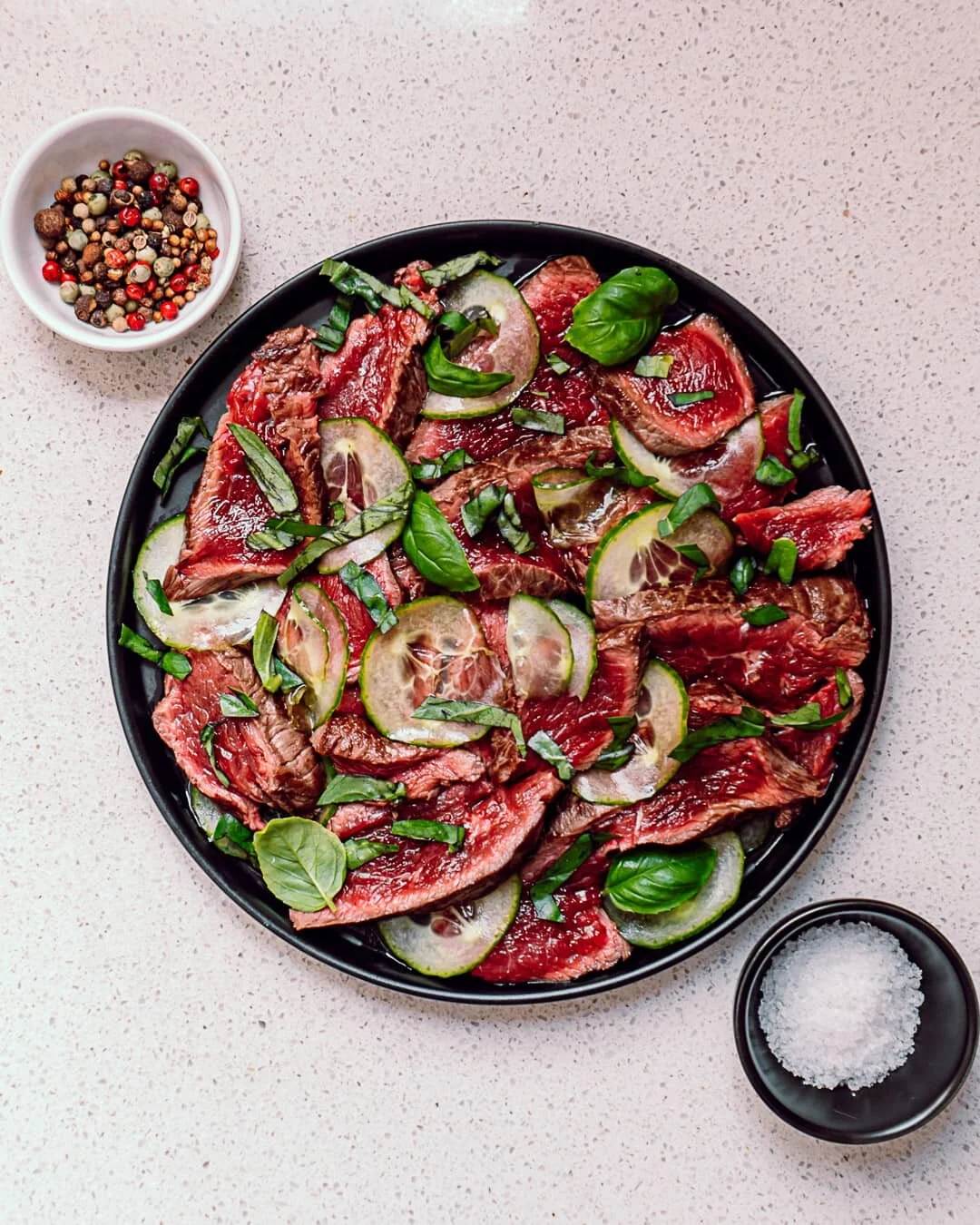 Disposez la viande et le concombre dans un plat ou une grande assiette plate, ajoutez le soja puis le basilic et un peu de fleur de sel.